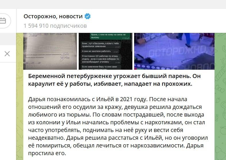 А есть СМИ с федеральным охватом, которые вполне сознательно этим занимаются. Вот, например, основной тг-канал медиахолдинга Собчак «Осторожно, новости»: подборка постов — наркоман Илья из Санкт-Петербурга угрожает своей беременной девушке, отец из Тюмени заставляет отжиматься 12-летнего сына, астраханец избил жену (он был в камуфляже, соцсети пишут, что СВОшник). Это не рандомная подборка — это новости о бытовом насилии от 22, 23 и 24 октября 2024 года.